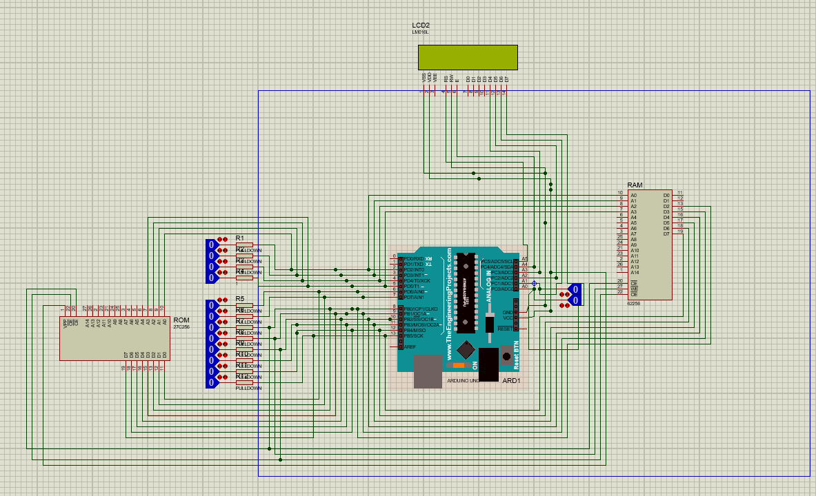 Proyecto realizado en Proteus donde se almacenan y leen iniciales mediante direcciones binarias.